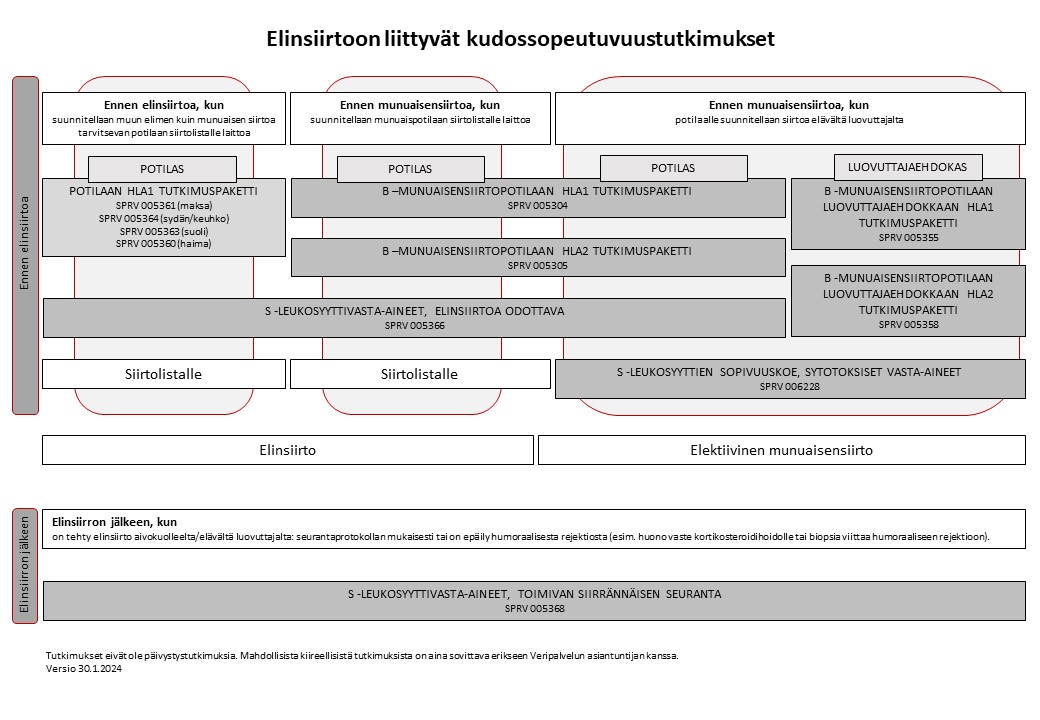 Eri elinsiirroissa käytännöt kudostyypityksen ja leukosyyttivasta-aineiden seulonnasta ja sopivuuskokeista hieman vaihtelevat. Tutkimuspakettien avulla eri potilasryhmistä tehdään siirtoyksiköiden kanssa sovitut tutkimukset.