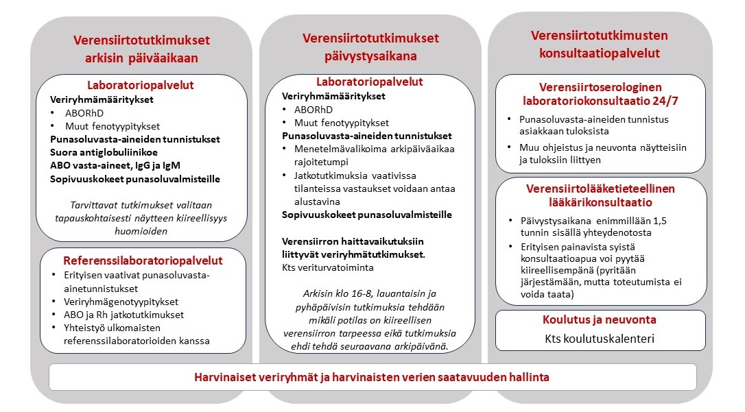 Veriryhmälaboratoriossa tehdään veren sopivuustutkimuksia sairaaloiden, terveyskeskusten ja yksityisten laboratorioiden lähettämistä näytteistä ennen mahdollista verensiirtoa. Verensiirtotutkimuksia ovat muun muassa