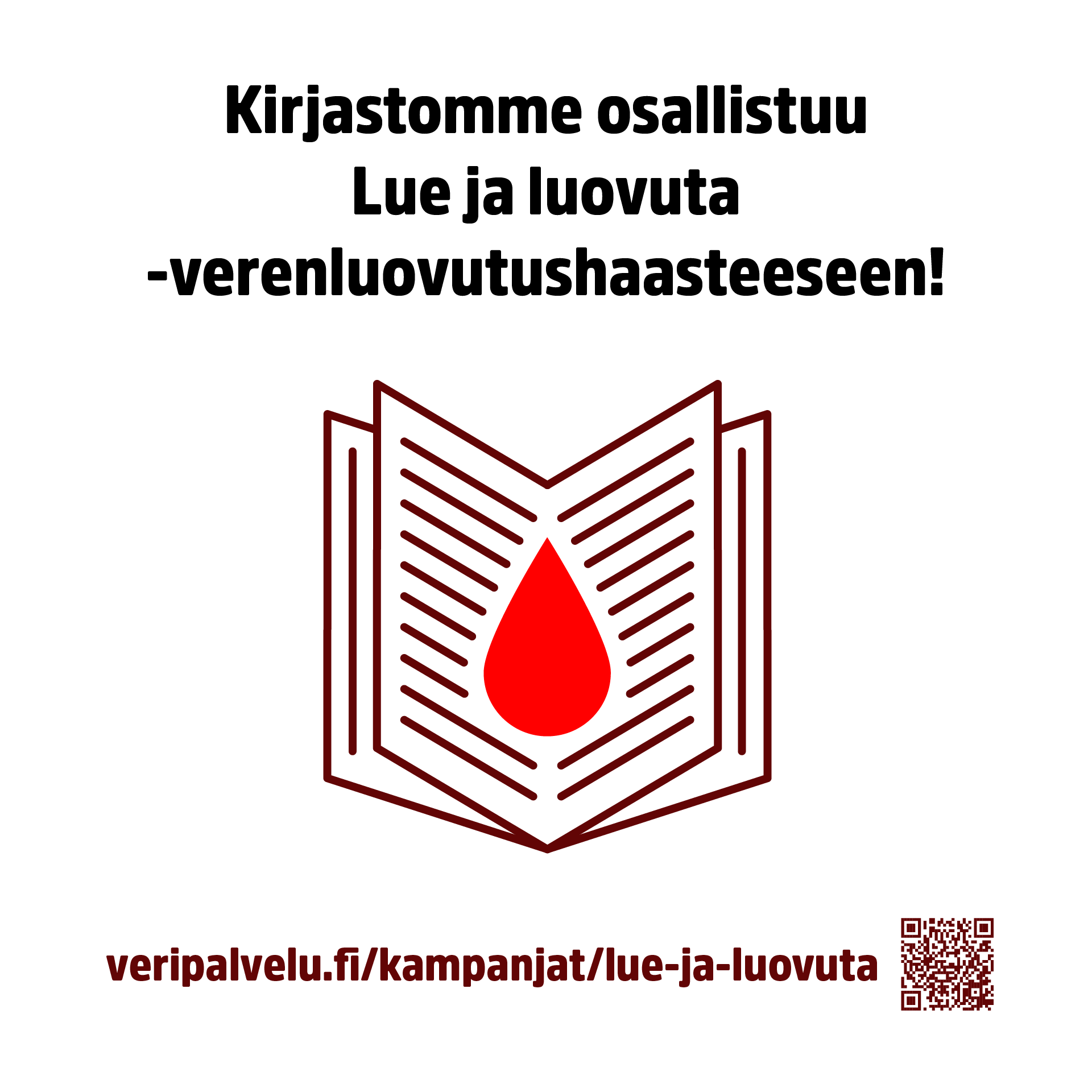 Lue ja luovuta on kirjojen ystävien oma verenluovutuskampanja. Haastamme kaikki Suomen kirjastot mukaan kampanjoimaan verenluovutuksen puolesta! Osallistuminen on helppoa: Perustakaa kirjastolle oma Luovuttajaryhmä ja kannustakaa kirjojen ystäviä mainitsemaan kirjaston nimi verenluovutuksessa.
