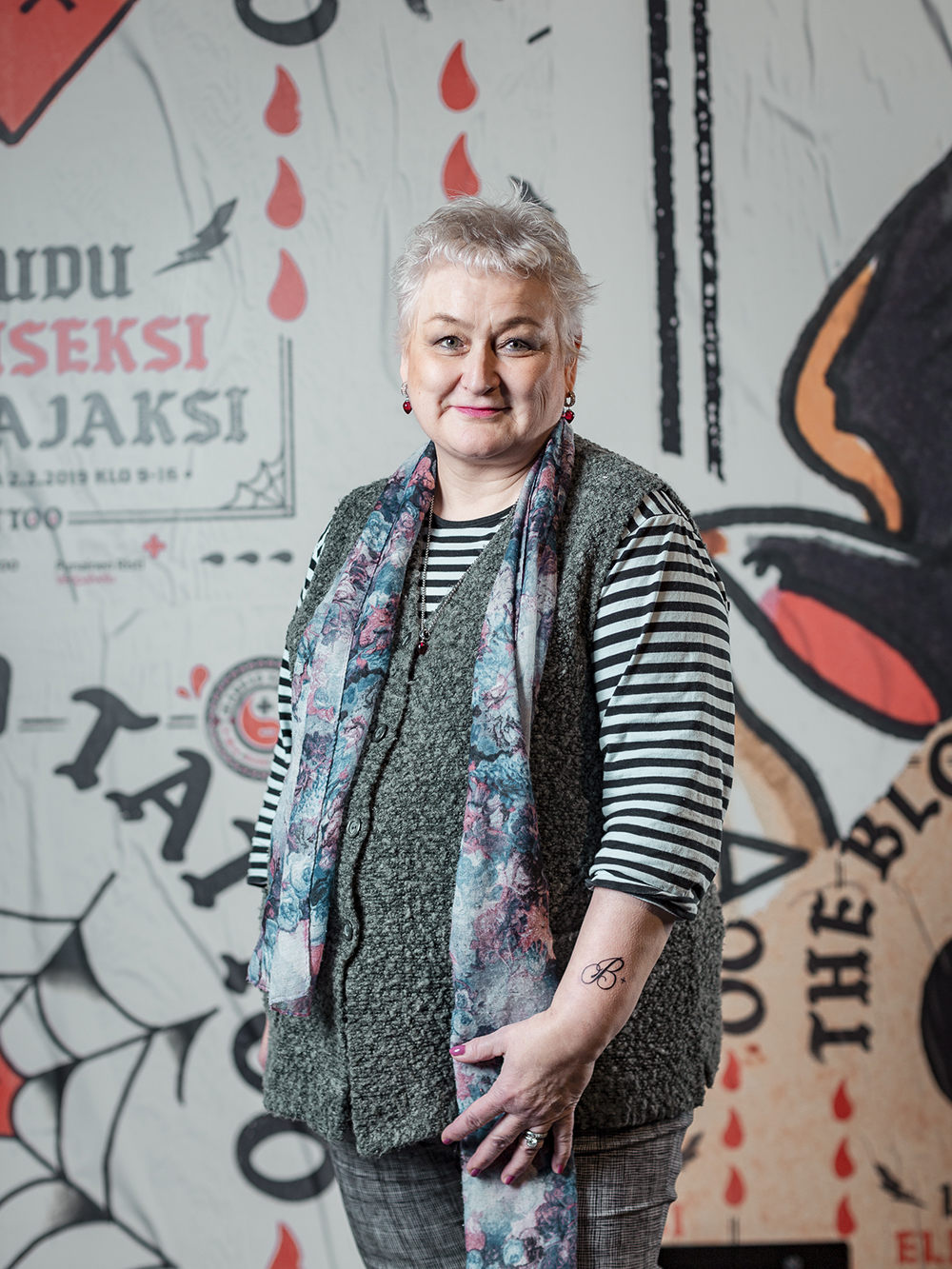 Päivi Syväsola otti ensimmäisen tatuointinsa Veripalvelun järjestämässä Blood Tattoo -tapahtumassa 2.2.2019. Hän olisi kuollut vuonna 1958 reesuslapsena, jollei hän olisi päässyt heti verensiirtoon. Lue Päivin kirjoittama tarina ja katso videohaastattelu.
