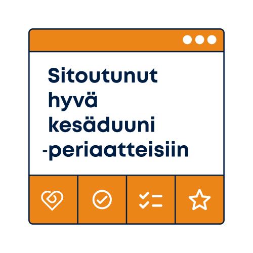 Olemme sitoutuneet Duunitorin Hyvä kesäduuni -periaatteisiin. Duunitorin Hyvä kesäduuni -tutkimus selvittää kesätyöntekijöiden kokemuksia eri työpaikoilla. Olemme tänä vuonna mukana tutkimuksessa, koska haluamme kuulla kesätyöntekijöitämme toimintamme kehittämisessä.